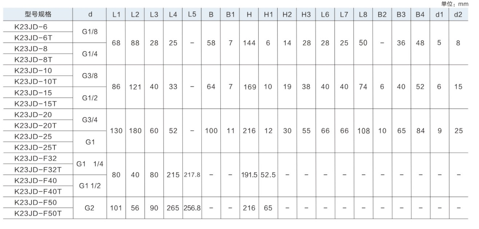 K23JD series electronically controlled stop valve is an end-face sealed stop-type directional valve. There are two structural forms: normally closed type and normally open type. This series of valves have low requirements for air purification, strong dust resistance, multiple specifications, and a wide diameter range. If the exhaust port is blocked, it can become a two-position, two-way on-off valve. The diameter of this series of valves is 6~25mm with plate connection and 32~50mm with flange connection.